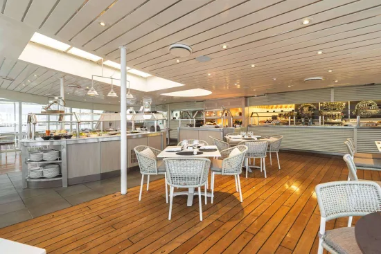 Cubierta de la piscina: un punto focal en cada viaje, la cubierta de la piscina se ampliará con la eliminación del tragaluz, se agrega una nueva piscina y un jacuzzi y se amplía el bar de la piscina. Los muebles nuevos incluyen sofás para descansar y coloridos pufs, otomanas y sillas alrededor de la piscina. Iluminación y acabados aumentan la diversión de las fiestas en la terraza de la piscina. La nueva vegetación alrededor del bar de la piscina añade un toque de color.