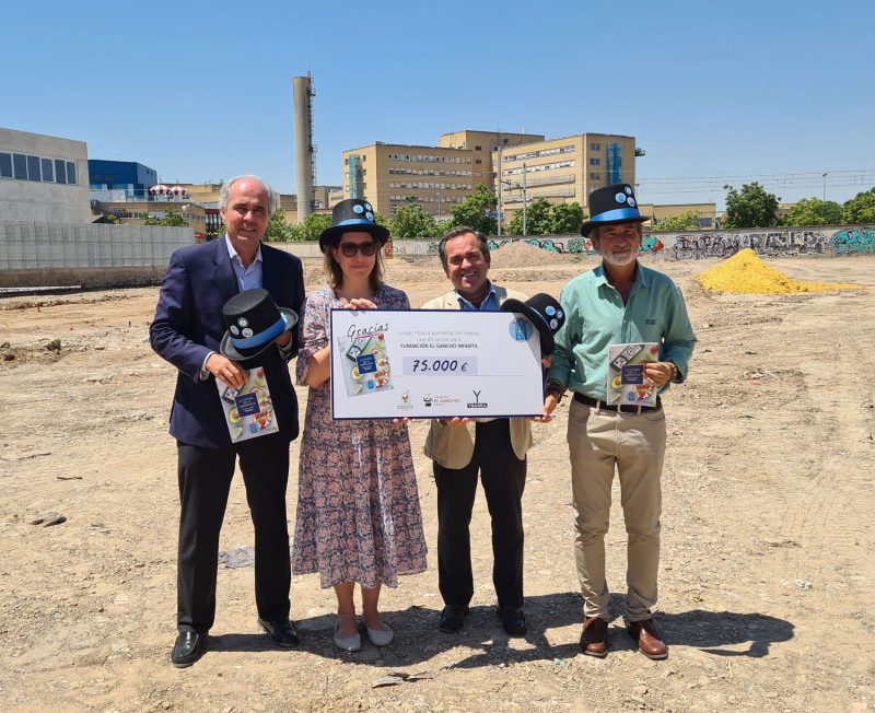 A la entrega del cheque simbólico por valor de 75.000€ (recaudados con la venta de los 15.000 primeros ejemplares), efectuada en el terreno de la futura Casa Ronald McDonald, han asistido el director general de Grupo Ybarra, Francisco Viguera, y el director de marketing y comunicación, Gonzalo Ybarra. Además, de la presidenta de la Fundación El Gancho Infantil, Marta Baturone y la responsable de comunicación de la Fundación Infantil Ronald McDonald, Rocío Balsón.