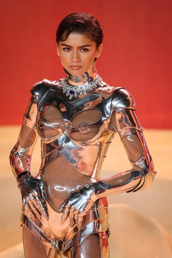 La también modelo, quien en la cinta encarna a Chani, una guerrera de una tribu del desierto llamada fremen, desfiló enfundada con un llamativo traje robótico estilo futurista con aberturas que dejaban ver parte de su piel.